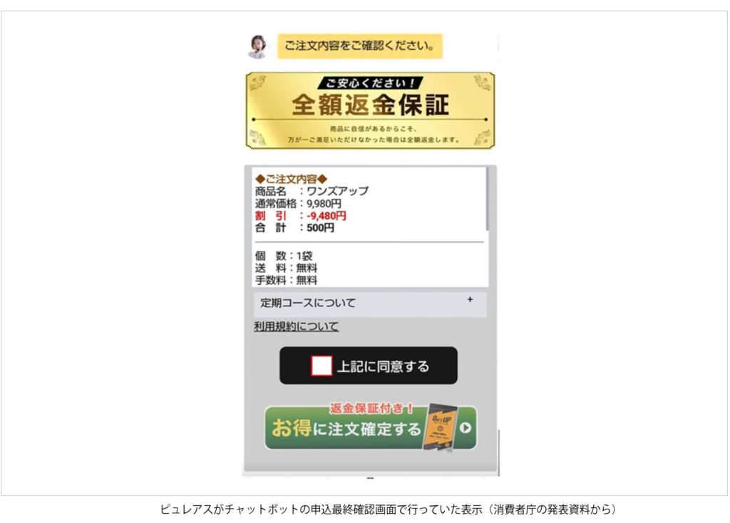消費者庁によると、同社は少なくとも昨年7月16日から10月21日までの間、1袋9,980円(税込、通常価格)のサプリメント『ワンズアップ』について、自社サイトや外部のSNS広告で「今ならキャンペーン価格500円で買えちゃうんです!」「定期縛りなし!! 1回で解約OK!」などと表示し、初回を500円で購入後、追加料金なしで定期購入を解除できるように訴求していた。しかし実際には、2回目の商品を受け取らずに契約を解除する場合、違約金として通常価格との差額の9,480円を支払う必要があった。