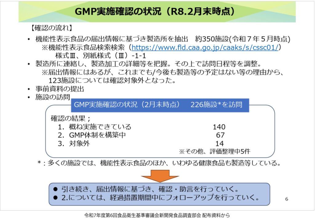 関連資料:消費者庁 令和7年度第6回食品衛生基準審議会新開発食品調査部会「機能性表示食品におけるGMP実施状況の確認について」