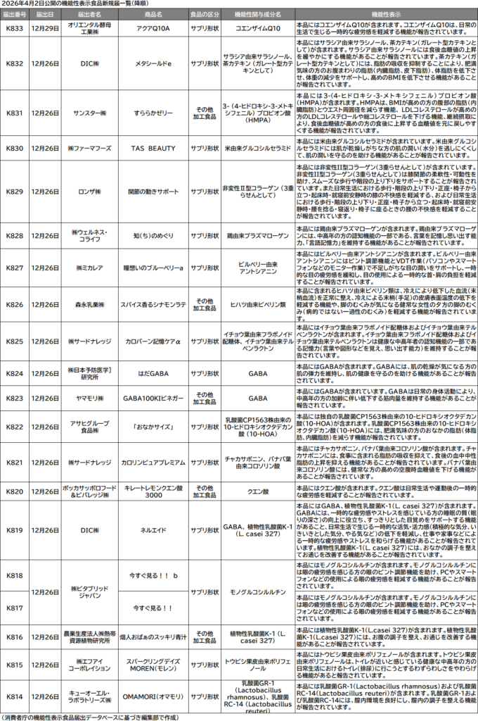 消費者庁は2日、機能性表示食品の届出情報検索データベース(DB)を更新し、新規20件(サプリメント形状15件、サプリ形状以外の加工食品5件、生鮮食品0件)に届出番号を付与して公開した。4月を迎えて新年度に入ったが、届出日上はまだ前年度。今回の更新では、同年12月26日と同29日に同庁へ届け出られた分が公開された。