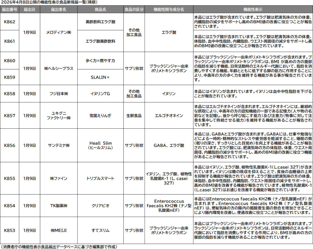 なお、8日の更新で公開された新規届出の概要は下の一覧のとおり。新規の機能性関与成分や機能性表示はなかったが、機能性関与成分の組み合わせで新規があった。イヌリン・エラグ酸・植物性乳酸菌K-1(L. casei 327)の3成分の組み合わせは今回が初めて。