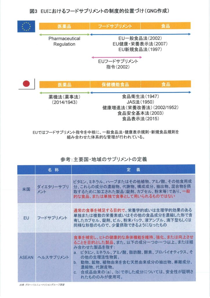 EUの「フードサプリメント(Food Supplement)」は、食品の一部としての位置付けが明確で、その規制思想は徹底した「源流管理」にある。ノベルフード制度とポジティブリスト制度を組み合わせることで、承認されていない成分は食品にもサプリメントにも使用できない仕組みを構築している(1997年5月以前にEU域内で食経験があるものは除く)。この厳格さはイノベーションを阻害するという批判も現地コンサルタントの一部から上がっているが、安全性の担保という観点では極めて高い水準を実現している。