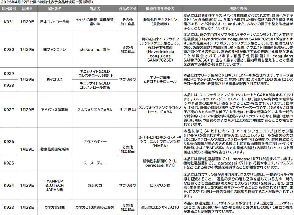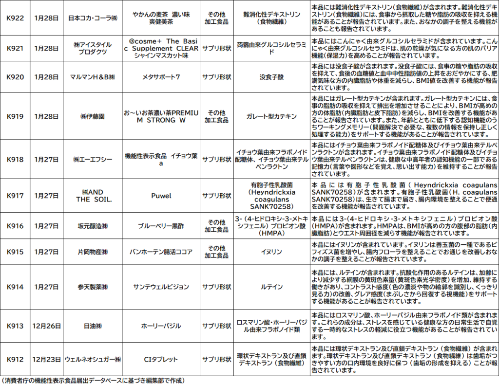 なお、消費者庁が同日のDB更新で届出番号を付与・公開したのは20件(サプリメント形状11件、サプリ形状以外の加工食品9件、生鮮食品0件)だった。