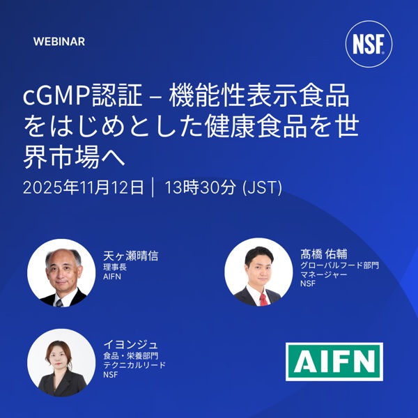 ウェビナーでは、日本の健康食品の製造・品質管理・輸出に関わる企業などを対象に、海外展開の鍵となる国際的なcGMP(Good Manufacturing Practice:適正製造規範)について解説する。世界180カ国以上で認証・監査を行うNSFの専門家が、国際基準の概要や最新動向、日本の制度(特に機能性表示食品)との違いなどを分かりやすく説明する。